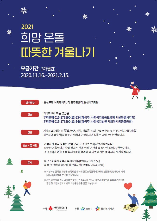 [아시아경제 박종일 기자] 용산구(구청장 성장현)가 지역 내 취약계층 지원을 위해 2021. 희망온돌 따뜻한 겨울나기(이하 따겨) 캠페인을 벌인다.