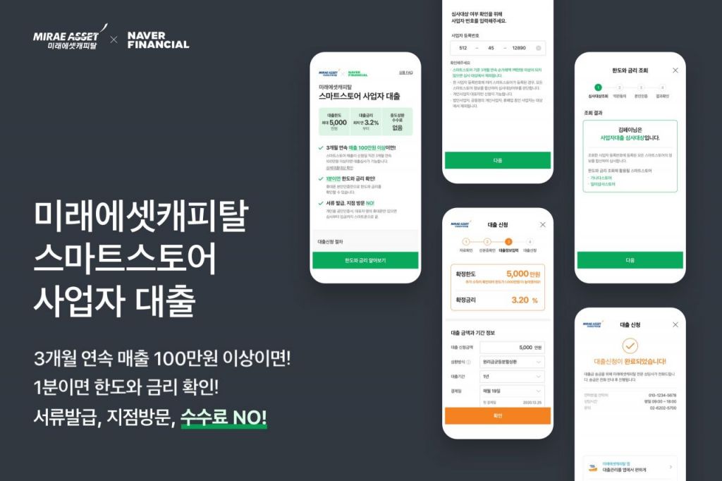 [아시아경제 기하영 기자]네이버파이낸셜이 미래에셋캐피탈과 함께 네이버 스마트스토어 사업자들을 위한 신용대출 상품인 '미래에셋캐피탈 스마트스토어 사업자 대출'을 시작한다고 1일 밝혔다.