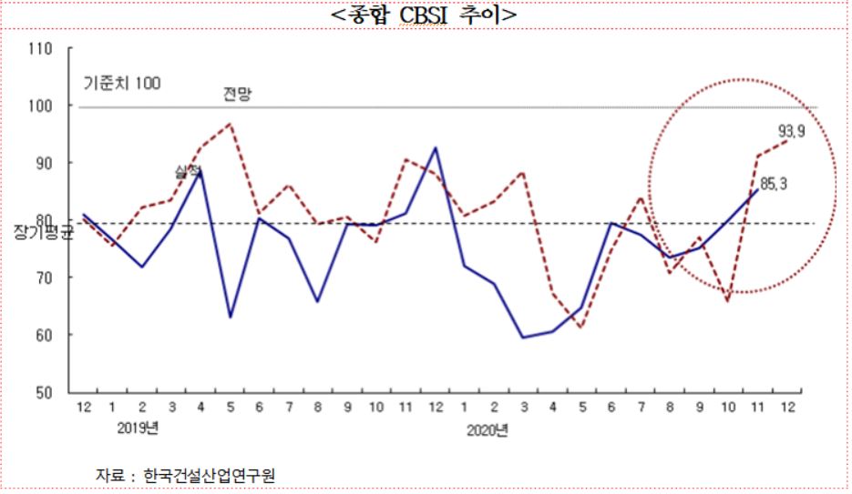 한편 12월 CBSI는 11월 대비 8.6포인트 상승한 93.9로 전망됐다. 박 부연구위원은 "통상 연말에는 수주가 증가하고 기성 진척 상황이 개선되는 계절적 영향으로 지수가 5~10포인트 상승하는데 이러한 영향이 지수에 반영된 것으로 판단된다"고 밝혔다.