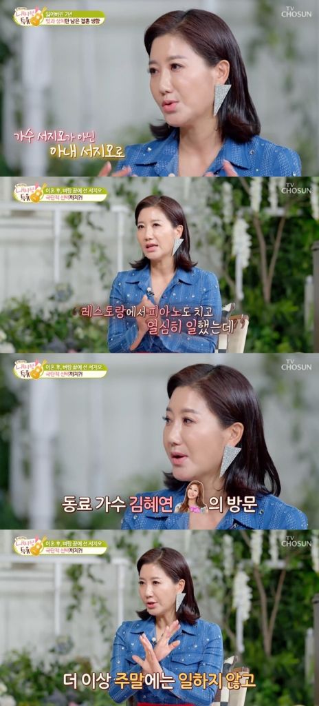 또 "결국 남편과 떨어지게 됐다. 이후 레스토랑에서 피아노도 쳐보고 열심히 아르바이트를 했는데 그 돈으로는 도저히 생활할 수 없었다. 도시가스, 전기도 다 끊겼었다"고 말했다.