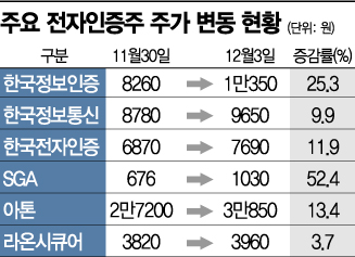 4일 한국거래소에 따르면 전날 한국정보인증은 전 거래일 대비 4.23% 오른 1만350원에 거래를 마쳤다. 한국정보통신과 한국전자인증 등도 각각 2.88%, 2.12% 상승했다. 이달 들어서만 한국정보인증(25.3%), 한국정보통신(9.9%), 한국전자인증(11.9%) 등 주가가 크게 뛰었다.
