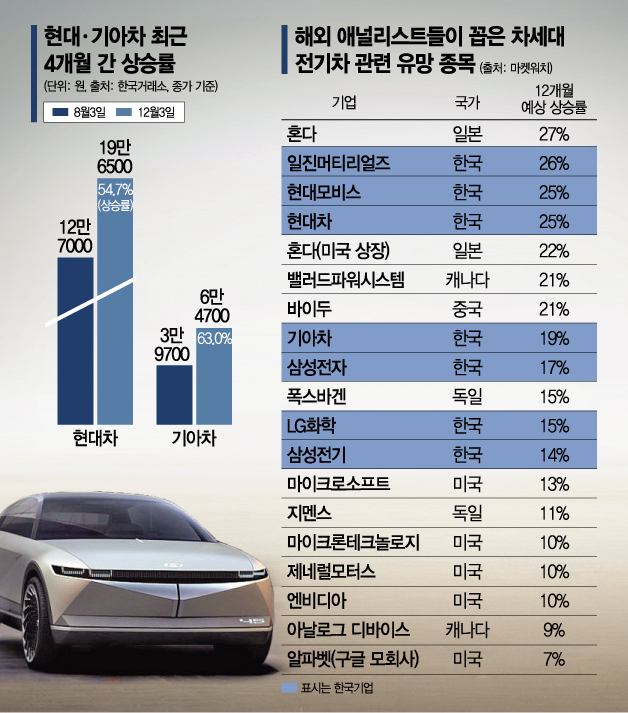 해외에서도 현대차와 기아차를 주목하고 있다. 차세대 전기차 시장을 이끌며 크게 상승할 것이라는 분석이다. 2일(현지시간) 경제전문 외신 마켓워치에 따르면 미국 증시 전기차 관련 주요 상장지수펀드(ETF) 3종에 포함된 종목 165개를 분석한 결과 해외 애널리스트들이 꼽은 차세대 전기차 관련 유망 종목 20개에 현대차와 기아차가 모두 포함됐다. 이들은 내년 현대차와 기아차의 주가가 각각 22만8884원, 7만1115원에 이를 것으로 내다봤다. 함께 꼽힌 종목 중 주가상승률 상위 4위, 8위에 차지했다. 이밖에도 일진머티리얼즈(2위), 현대모비스(3위), 삼성전자(9위), LG화학(11위), 삼성전기(12위) 등 국내 기업들이 대거 이름을 올렸다. 포함된 미국 기업 수(6곳)조차 앞질렀다. 일본과 독일, 캐나다 등은 2곳에 그쳤다.