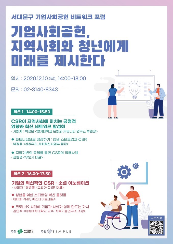 ‘기업사회공헌, 지역사회와 청년에게 미래를 제시한다’라는 주제로 기업의 사회적 책임(CSR, Corporate Social Responsibility) 사례와 전략에 대해 해당 분야의 전문가들이 발제, 토론한다.