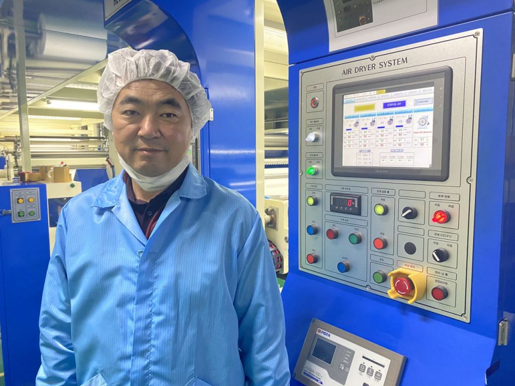 김창호 한국알미늄 대표가 충북 증평 공장에서 알루미늄 포장재 필름 생산라인을 점검하고 있다. 사진 = 김희윤 기자