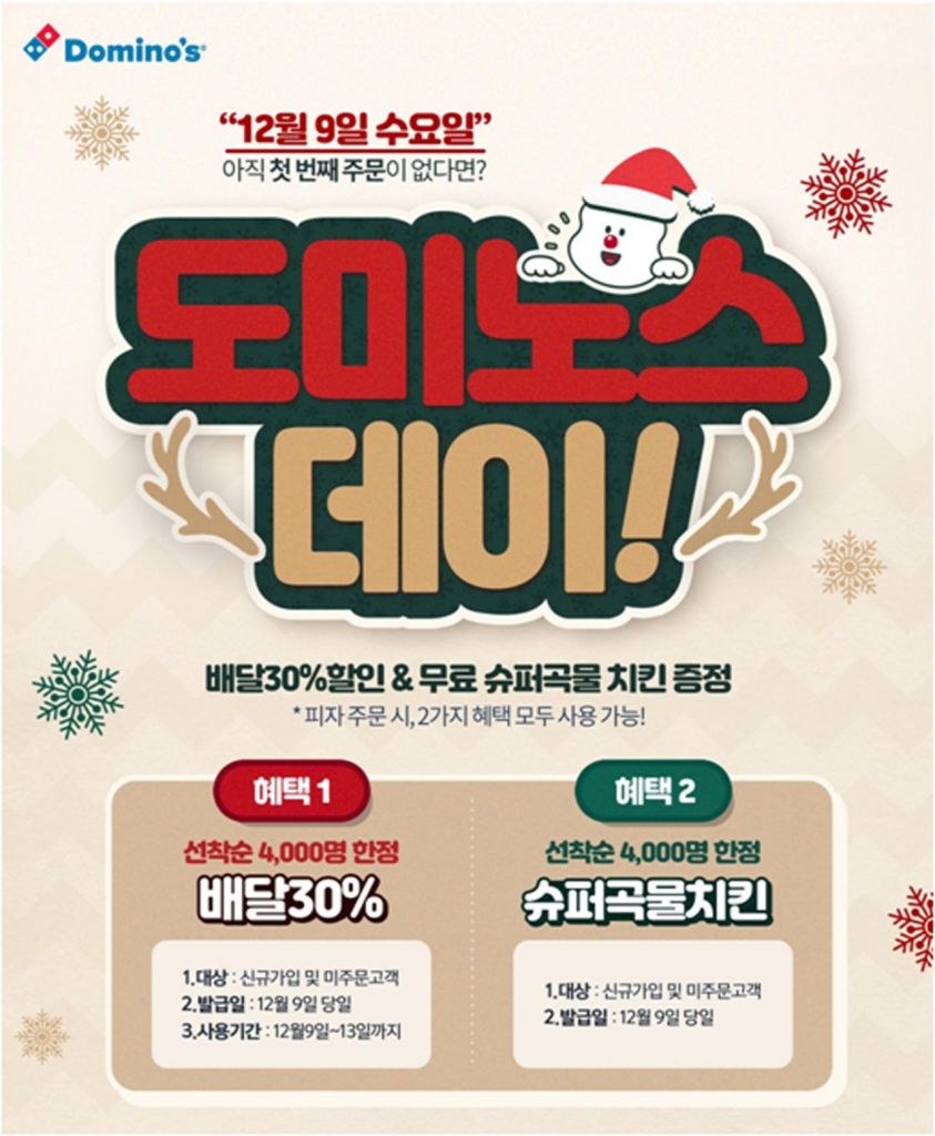 9일까지 온라인 홈페이지에 가입한 신규 고객 중 주문 내역이 없는 고객을 대상으로 피자 주문 시 사용 가능한 ‘피자 배달 30% 할인 쿠폰’과 ‘슈퍼곡물 치킨 무료 쿠폰’을 도미노피자 홈페이지에서 각각 제공한다.