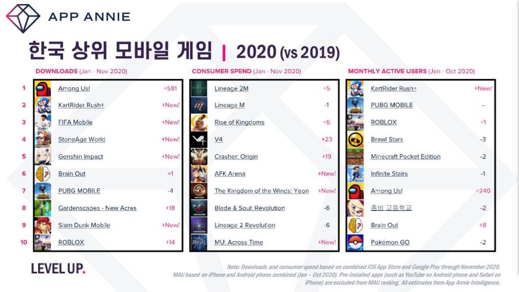 한국 모바일 게임 다운로드 랭킹 1위는 '어몽어스'가 차지했다. '카트라이더 러쉬플러스', '피파 모바일', '스톤에이지 월드', '원신'이 이어 2위부터 5위를 기록했다.