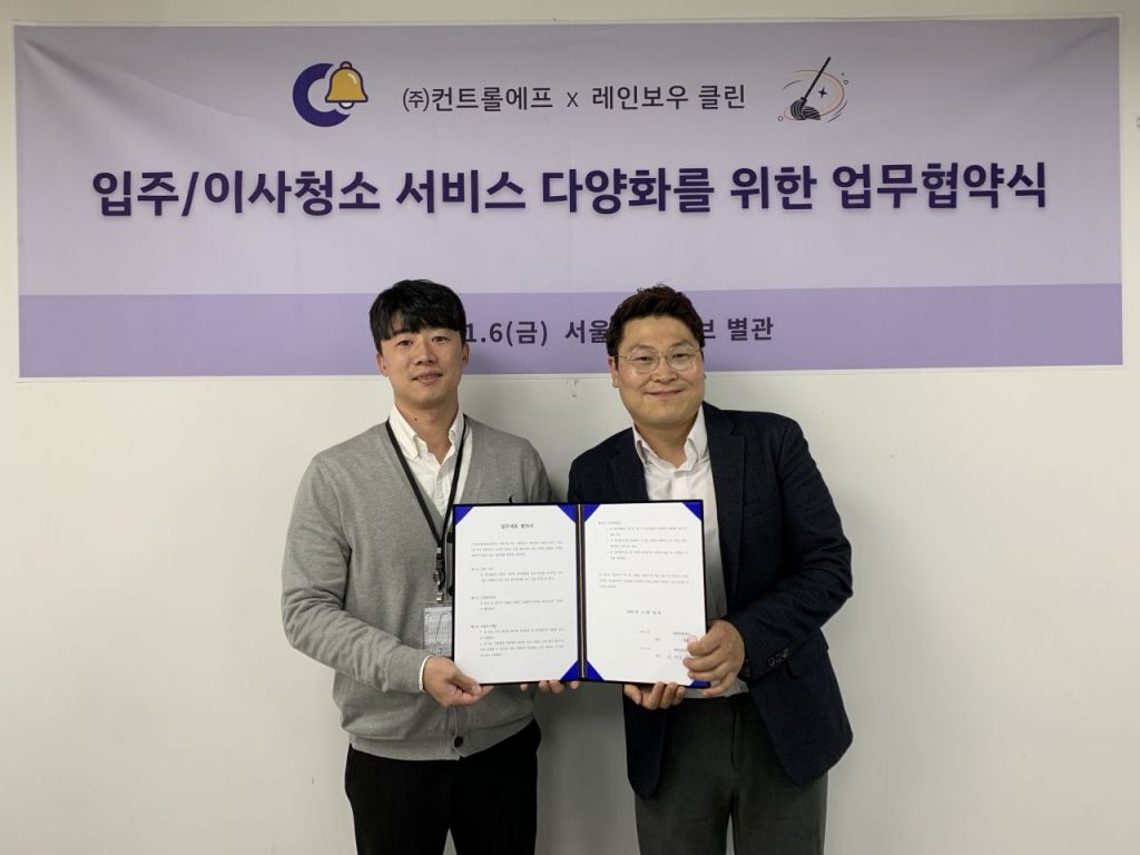 지난 6일 이용규 컨트롤에프·클린벨 대표와 정재훈 레인보우클린 대표가 서울 마포구 서울창업허브 본사에서 클린벨 프리미엄 청소사업부 2팀에 대한 업무협약(MOU)를 체결했다.