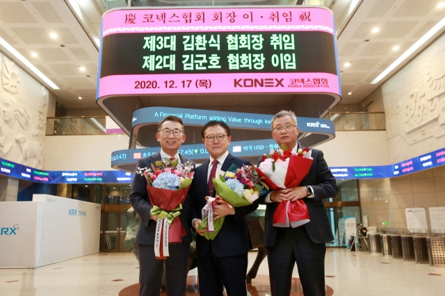 왼쪽부터 김군호 제2대 협회장(에프앤가이드 대표이사), 김환식 제3대 협회장(한중엔시에스 대표이사), 김창호 초대협회장(아진엑스텍 대표이사). 사진제공=코넥스협회