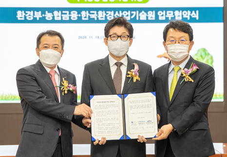 조명래 환경부 장관(가운데)은 지난달 18일 서울 중구 농협 본사에서 진행된 '녹색금융 활성화를 위한 업무협약(MOU)식'에 참석해 녹색분야 투자를 위한 금융권의 역할과 책임을 당부했다.