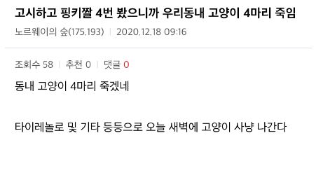 "고시하고 핑키짤 4번 봤으니까 우리동내 고양이 4마리 죽임" 제목으로 "동네 고양이 4마리 죽겠네. 타이레놀로 및 기타 등등으로 오늘 새벽에 고양이 사냥 나간다"라고 적었다.