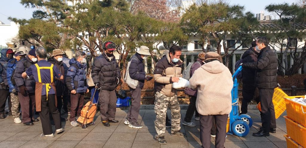 30분가량 줄을 서서 주먹밥이나 도시락을 건네받은 노인들은 볕이 잘 드는 길 위에서 이를 먹거나 가방에 넣은 채 지하철역으로 향했다. 사회적 거리두기가 2.5단계로 격상되며 무료급식소 실내 이용이 어려워졌기 때문이다. 이에 무료급식소들은 주먹밥을 만들거나 도시락을 주문해 노인들에게 나눠주는 방식으로 바꿨다. 배식을 받은 노인들은 삼삼오오 모여 다른 곳에 위치한 무료급식소로 발길을 옮겼다. 실제로 이날 배식을 받은 노인 중 대부분이 종로에서 아침ㆍ점심 식사를 마친 후 오후에는 성남에 위치한 무료급식소 '안나의집'으로 이동해 저녁을 때우는 게 하루 일과라고 말했다.