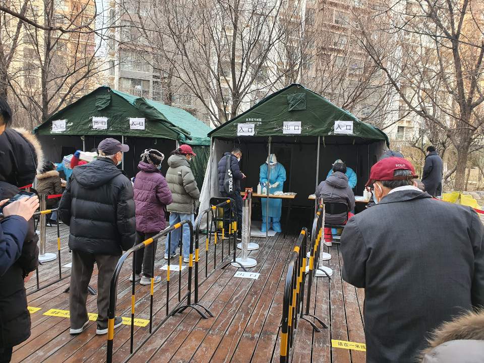 중국 베이징 차오양구 왕징 한 아파트 주민들이 코로나19 검사를 받고 있다.