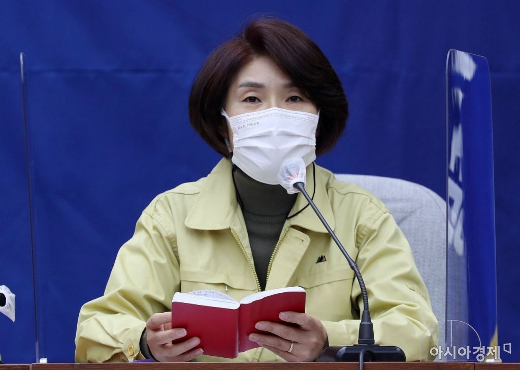 한정애 더불어민주당 정책위의장이 29일 국회에서 열린 원내대책회의에 참석, 모두발언을 하고 있다./윤동주 기자 doso7@