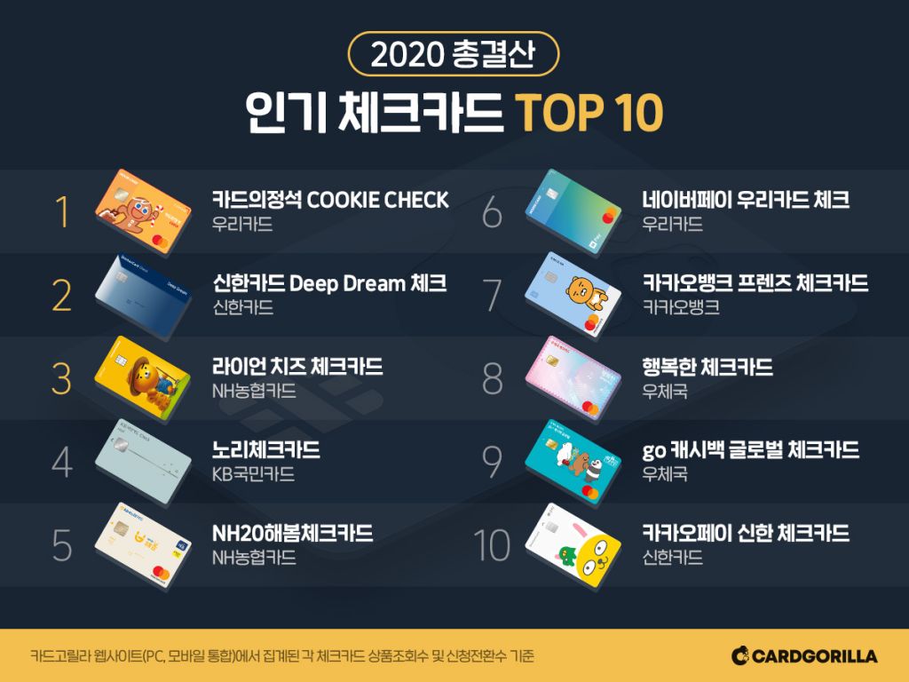 1일 국내 최대 신용카드 전문사이트 카드고릴라에 따르면, '2020년 총결산 인기 체크카드 톱 10'에 우리 카드의정석 쿠키체크가 2019년 총결산에 이어 1위를 차지했다. 해당 순위는 2020년 1월1일부터 12월18일까지 카드코릴라 웹사이트(PC, 모바일 통합)에서 집계된 각 체크카드 상품조회수와 신청전환수를 기준으로 매겨졌다.