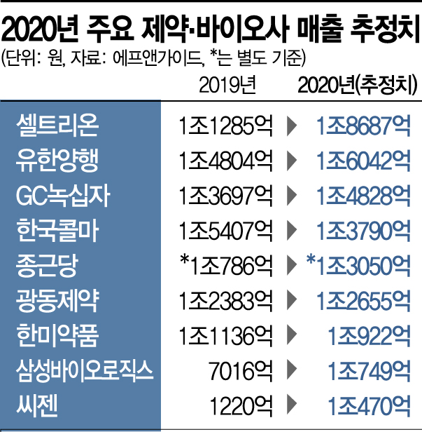 업계 관계자는 "바이오 기업들이 줄줄이 1조 클럽에 이름을 올린 것은 업계의 지각변동을 알리는 신호"라며 "국내 바이오 업계가 본격적인 성장 궤도에 진입한 것으로 분석된다"고 말했다. 제약업계에선 유한양행, GC녹십자, 한국콜마, 종근당, 광동제약, 한미약품이 연 매출 1조원을 넘길 것으로 추정된다.