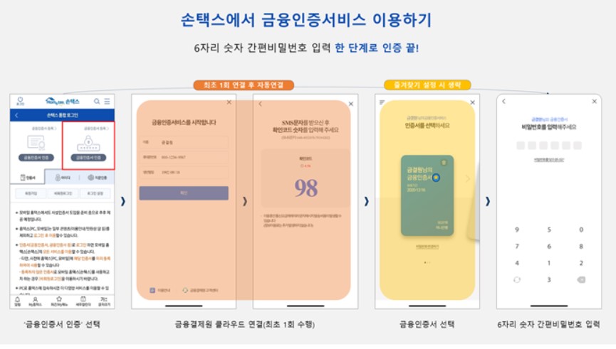 금융인증서비스를 처음 이용하는 고객은 은행 인터넷·모바일뱅킹에서 금융인증서를 무료로 발급받아 금융인증서비스가 적용된 모든 전자거래 업무에 이용할 수 있다. 금융인증서비스 이용 고객은 홈택스에서 ‘공동인증서 로그인(구 공인인증서·금융인증서)’ 또는 손택스에서 ‘금융인증서 로그인’을 선택한 후 간편비밀번호를 입력하면 인증이 완료된다.
