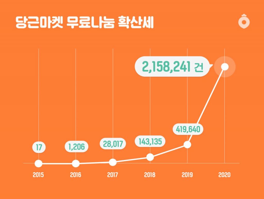 2016년 1200여건으로 시작된 이웃간 나눔은 2017년 2만8000건을 넘어섰고, 이듬해 14만건을 훌쩍 뛰어 넘었다. 구글플레이 '올해의 베스트 앱'으로 선정된 2019년에는 41만건에 달했고, 1300만 월간 사용자수를 기록한 지난해에는 215만건까지 치솟았다. 당근마켓 관계자는 "무료 나눔은 동네 방방곡곡으로 퍼져 나가며 이웃 간 온정을 나누는 나눔 문화의 중심으로 빠르게 자리잡았다"며 "누군가 권유하지 않아도 가까운 이웃들을 위해 먼저 나서서 나눔을 실천했고, 그 나눔은 또 다른 나눔이 돼 지역사회에 빠르게 스며들었다"고 설명했다.