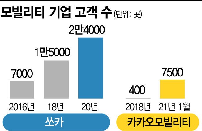 모빌리티 기업 입장에서는 ‘큰손’인 기업 회원들과 정기적으로 계약을 맺으면 고정적 매출 확보가 가능하다. 이 때문에 쏘카와 카카오모빌리티는 기업 전용 상품 경쟁이 한창이다. 쏘카는 전날 기업 고객 전용 구독 상품을 선보였다. 직원 1명당 월 9만9000원으로 멤버십을 무제한 이용하는 상품이다. 카카오모빌리티는 택시가 바로 잡히는 ‘카카오 T 플러스’를 기업 전용으로 출시했다.