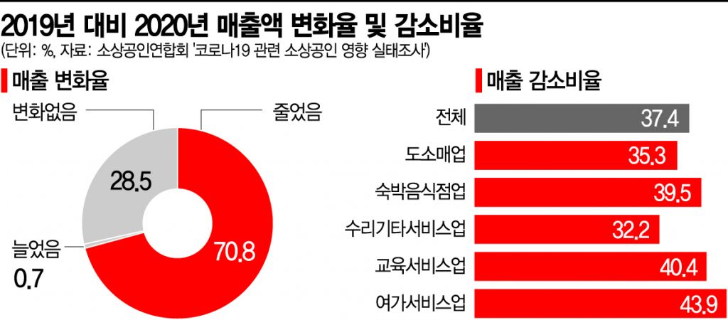 우리 정부도 손 놓고 있지만은 않았다. 자영업자들을 지원하기 위해 이달 11일부터 맞춤형 재난지원금(3차) 지급을 시작했다. 유흥업소나 학원, 실내체육시설 등 집합금지업종과 식당, 카페, 이·미용업 등 영업제한업종은 각각 300만원과 200만원, 일반업종은 100만원까지 소상공인 버팀목자금으로 지원받을 수 있다.