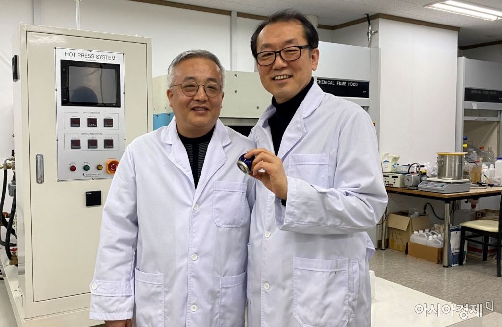 안현우(왼쪽) 소프트피브이 대표(CEO)와 이성규 소프트피브이 최고기술경영자(CTO). 이 대표가 들고 있는 모형은 소프트셀을 50배 확대한 것이다.사진 = 김희윤 기자