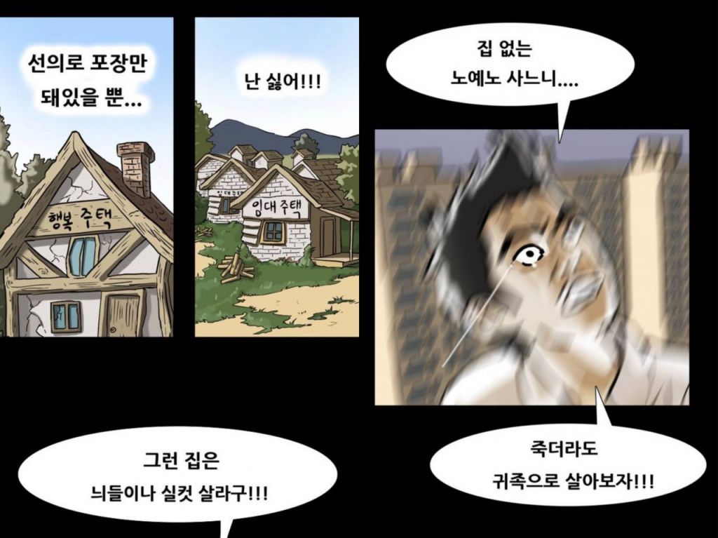 또 웹툰에서는 "착하다고 해서 누가 집을 주지 않아", "그렇게 평생 일 한다고 해도 월급보다 빨리 오르는 이런 집을 살 수 있겠냐", "니가 그 돈을 모을 수 있을 것 같아? 평생 월세나 살다 죽을 셈이냐" 등 급등한 집값을 풍자하는 대사도 등장한다.