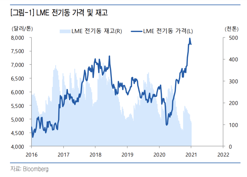 런던금속거래소(LME)가 고시한 가격을 보면 구리 현물 가격은 톤당 7980달러 선을 기록 중이다. 신종 코로나바이러스감염증(코로나19) 여파로 4160달러까지 떨어졌던 구리 가격이 1년도 채 되지 않아 88%가량 급등한 것이다.