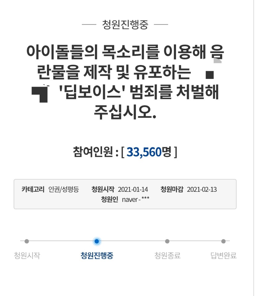 17일 국민청원 게시판에는 '아이돌들의 목소리를 이용해 음란물을 제작·유포하는 '딥보이스' 범죄를 처벌해주십시오'라는 제목의 청원이 올라왔다.