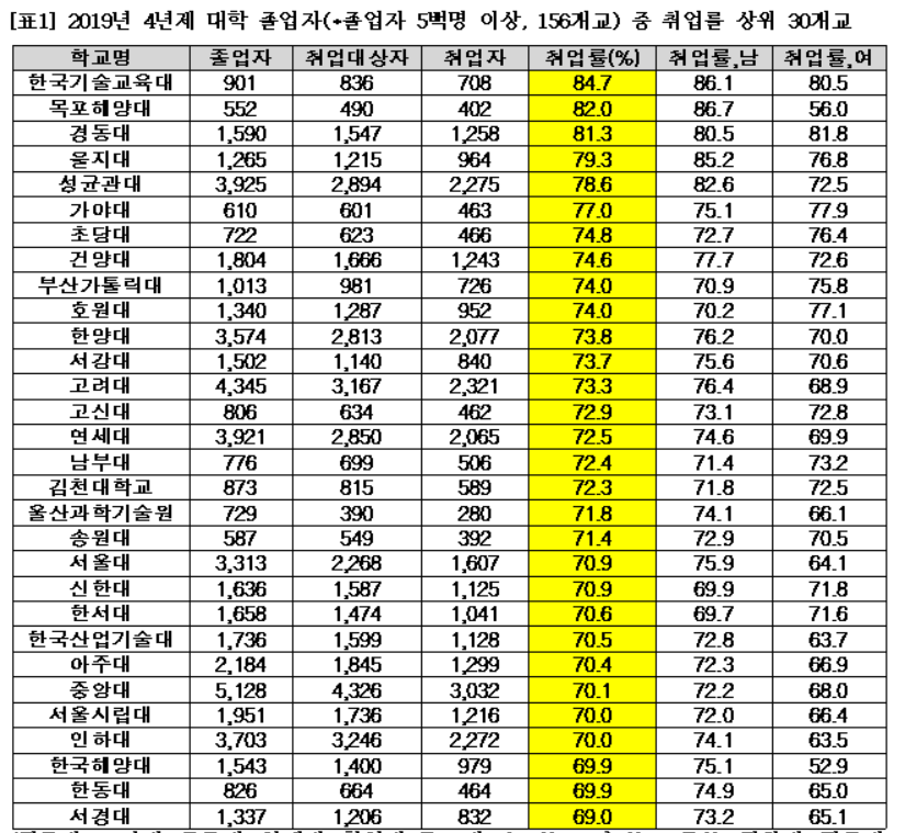 19일 종로학원하늘교육이 졸업자 500명 이상인 4년제 대학 취업률을 분석한 결과, 한국기술교육대의 취업률은 84.7%로 1위였다. 그 다음으로는 목포해양대(82.0%), 경동대(81.3%), 을지대(79.3%), 성균관대(79.3%), 가야대(77.0%) 순이었다.