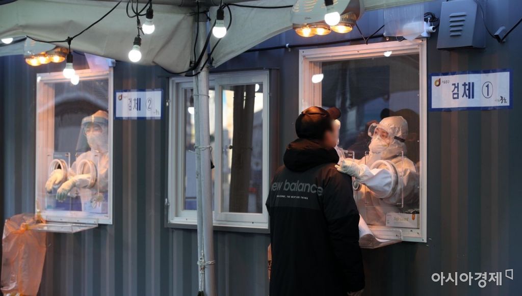 19일 서울역 광장에 마련된 신종 코로나바이러스 감염증(코로나19) 임시 선별검사소에서 의료진이 검체 채취를 하고 있다. 오는 20일은 국내에서 코로나19 첫 확진자가 나온 지 꼭 1년째가 되는 날이다./김현민 기자 kimhyun81@
