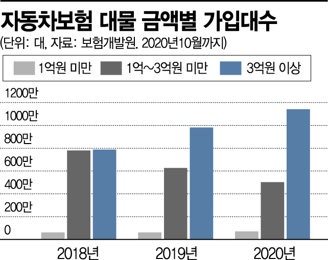 20일 보험개발원에 따르면 지난해 10월까지 자동차보험 대물배상 가입대수 1714만9000대 중 3억원 이상 가입대수는 1141만5000대를 기록했다.