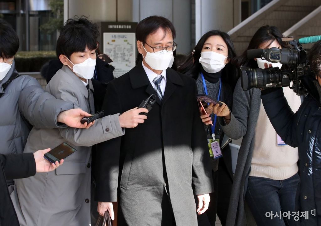 한동훈 검사장과의 '몸싸움 압수수색' 사건으로 재판에 넘겨진 정진웅 광주지검 차장검사가 20일 서울 서초구 서울중앙지법에서 열린 첫 공판을 마친 뒤 청사를 나서고 있다. 정 차장검사는 작년 7월 29일 이동재 전 채널A 기자의 강요미수 사건과 관련해 한동훈 검사장의 휴대전화 유심칩을 압수수색 하는 과정에서 한 검사장을 폭행한 혐의로 지난해 10월 기소됐다./김현민 기자 kimhyun81@