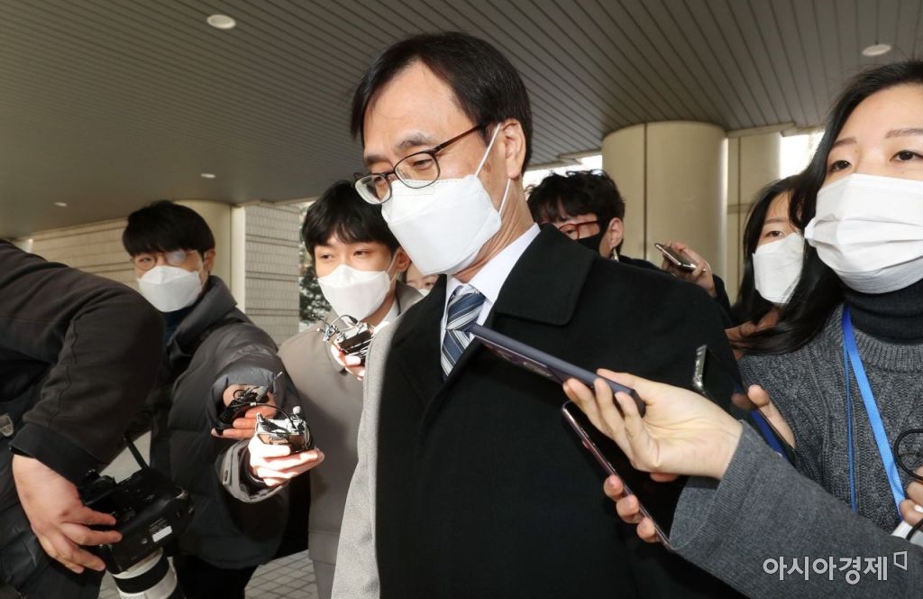 한동훈 검사장과의 '몸싸움 압수수색' 사건으로 재판에 넘겨진 정진웅 광주지검 차장검사가 20일 서울 서초구 서울중앙지법에서 열린 첫 공판을 마친 뒤 청사를 나서고 있다. 정 차장검사는 작년 7월 29일 이동재 전 채널A 기자의 강요미수 사건과 관련해 한동훈 검사장의 휴대전화 유심칩을 압수수색 하는 과정에서 한 검사장을 폭행한 혐의로 지난해 10월 기소됐다./김현민 기자 kimhyun81@