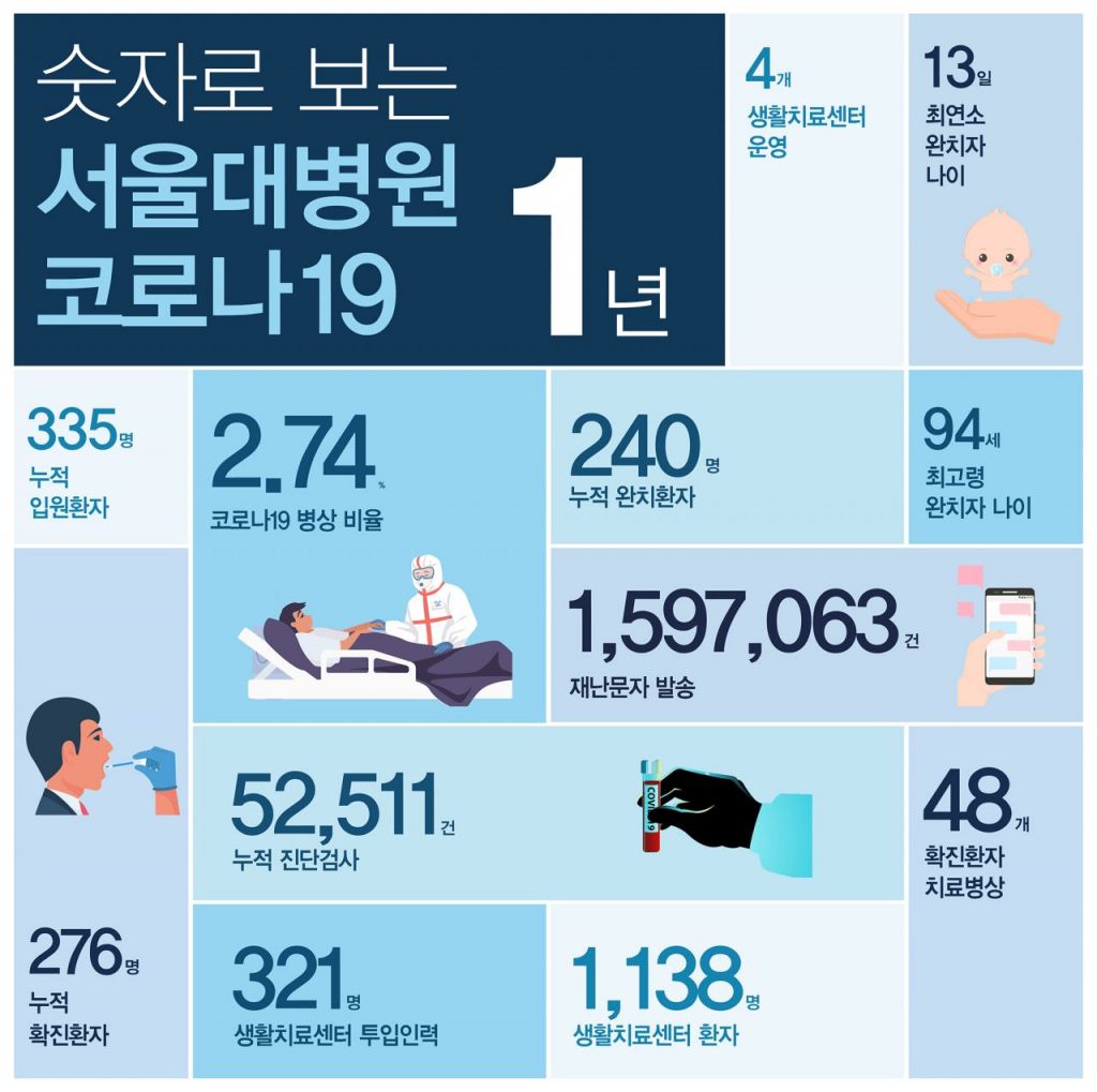 [아시아경제 이춘희 기자] 서울대병원이 신종 코로나바이러스감염증(코로나19) 국내 첫 환자 발생 이후 1년을 숫자로 정리했다.
