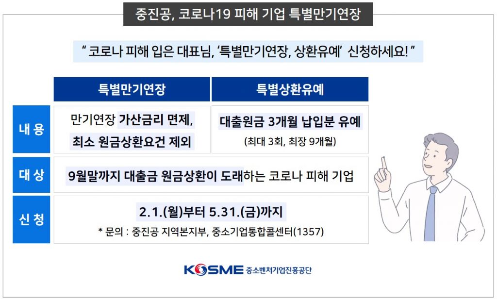 특별만기연장 및 특별상환유예 신청과 관련한 자세한 내용은 중진공 32개 지역본지부 또는 중소기업통합콜센터로 문의하면 된다. 김학도 이사장은 "지난해 코로나19 피해기업 지원을 포함하여 총 7000억원의 대출금 만기연장을 실시해 중소기업 유동성 위기 해소를 뒷받침했다"면서, "올해도 선제적이고 신속한 지원을 통해 중소기업이 하루 빨리 어려움에서 벗어날 수 있도록 지원하겠다"고 말했다.