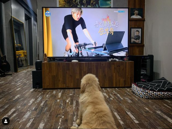 사진에는 박은석의 골든 레드 리트리버 품종 강아지 몰리의 뒷모습이 담겼다. 생후 3개월의 강아지 몰리는 '나 혼자 산다' 재방송을 집중해서 보는 듯한 모습이다.