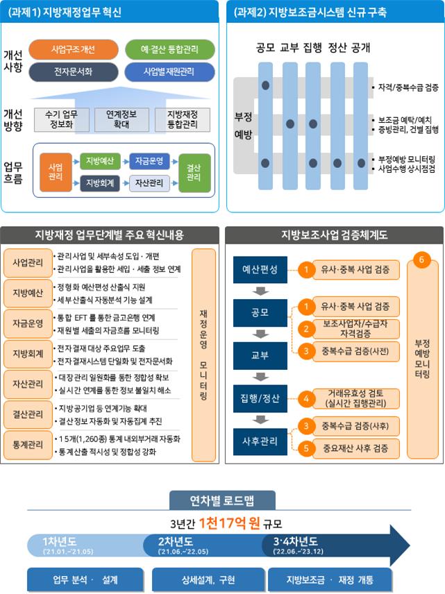 이번 차세대 지방재정관리시스템은 4가지 전략과제 구현에 역점을 둔다. 지방재정업무 혁신과제는 재정업무처리와 사업관리를 위한 시스템을 구축해 재정정보의 품질을 높이고 단절된 업무 프로세스를 연결해 사용자의 불편을 해소한다. 신규 지방보조금시스템 구축으로 지방재정 기능을 공동 활용해 공모, 사업수행, 집행·정산, 사후관리에 이르기까지 보조사업 전 과정 관리 및 보조사업검증 체계를 마련한다. 이를 통해 국가와 지방간 보조금 중복·부정방지 체계가 마련되어 각종 부정수급 행위에 효과적인 대응을 할 수 있게 된다.