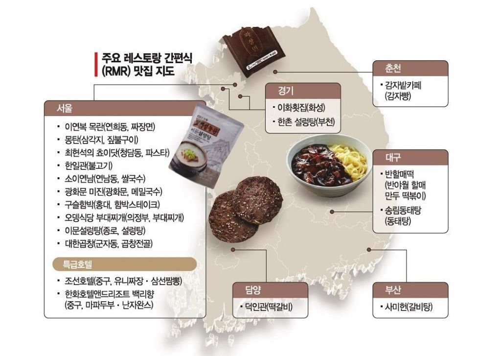 이름만 들어도 알만한 맛집들이 즐비하다. 60년 이상의 전통을 지닌 ‘광화문 미진’, 이연복 셰프의 ‘목란’, 명동 유명 맛집인 ‘금산제면소’, 평양냉면 명가 ‘봉피양’, 이태원 베트남 식당 ‘레호이’ 등 유명 맛집들을 비롯해 ‘강남면옥’, ‘투뿔등심’, ‘석관동떡볶이’, ‘빕스’ 등 프랜차이즈 브랜드 등이 있다. 부산 유명 맛집인 ‘사미헌’의 갈비탕과 인천 대표 고깃집 ‘숭의가든’의 한돈 목살 양념구이, 이태원의 이탈리아 레스토랑 ‘라쿠치나’의 그릴드 비프 파니니 등도 인기다. 가격은 식당 판매 가격보다 10~20% 가량 저렴한 편이라 간편식 치고는 비싼 편이지만 유명 맛집 메뉴를 집에서 간편하게 맛볼 수 있다는 점에서 인기가 높다.