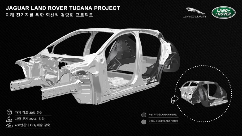 재규어 랜드로버는 카본 파이버와 같은 맞춤형 복합소재를 전략적으로 사용해 차체 강성을 30% 향상시키고, 무게는 35kg 줄이면서 차량 충돌 시 안전성은 높이도록 구조를 개선하는 것을 목표로 한다. 차체 무게 감소 시 더욱 큰 배터리 장착이 가능해져 이산화탄소 배출량의 변화 없이 주행 거리를 늘릴 수 있다.