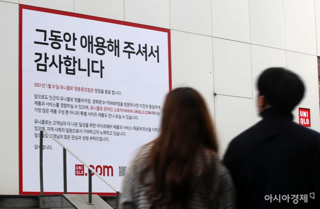 31일 서울 중구 유니클로 명동중앙점에 영업 종료 안내문이 붙어 있다. 플래그십 스토어인 유니클로 명동중앙점은 노재팬 운동과 코로나19로 인한 명동 상권 타격으로 이날까지 운영하고 문을 닫게된다./김현민 기자 kimhyun81@