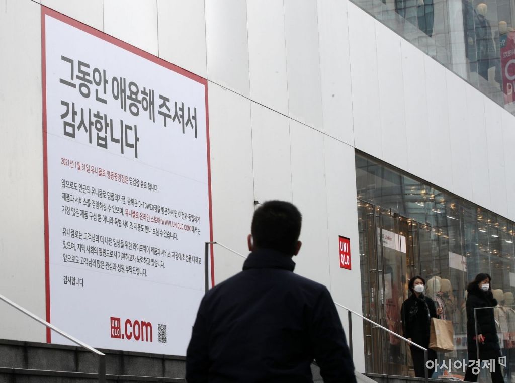 31일 서울 중구 유니클로 명동중앙점에 영업 종료 안내문이 붙어 있다. 플래그십 스토어인 유니클로 명동중앙점은 노재팬 운동과 코로나19로 인한 명동 상권 타격으로 이날까지 운영하고 문을 닫게된다./김현민 기자 kimhyun81@