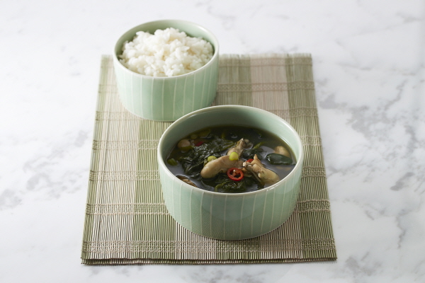 시금치 100g, 소금 약간, 굴 100g, 대파 1/6대, 홍고추 1/2개, 물 3컵, 된장 2, 다진 마늘 1, 소금·후춧가루 약간씩
