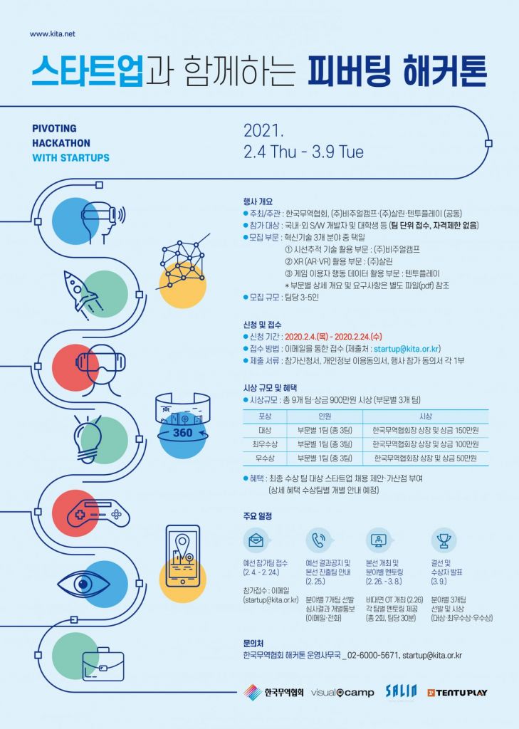 이번 대회는 해커톤을 공동 주최하는 비주얼캠프, 살린, 텐투플레이 등 스타트업 3개사의 ▲사용자 시선 추적 기술 ▲증강현실(AR) 및 가상현실(VR) 기술 ▲게임 이용자 행동분석 기술을 활용해 혁신 서비스와 신규 사업모델을 개발하기 위해 마련됐다.