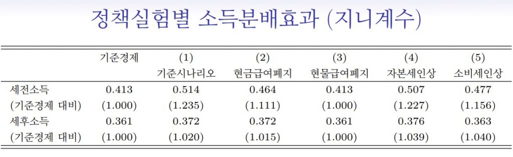 분석에 따르면 코로나19 이전인 2019년 기준경제에서 소득 불평등을 나타내는 세전소득 지니계수는 0.413이었지만, 기본소득을 도입하기 위해 시나리오를 반영하면 다섯가지 시나리오 대부분에서 지니계수가 올랐다. 기본소득 도입시 지니계수는 0.464~0.514까지 오를 수 있다는 분석이다. 지니계수 값이 커질수록 소득분배 불평등이 심화되는 것으로 해석할 수 있다.