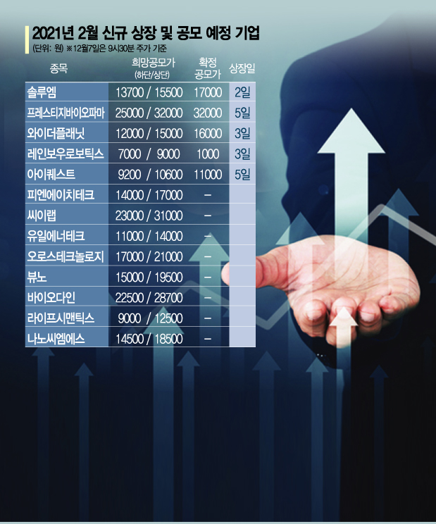 4일 한국거래소에 따르면 2월 상장 및 공모청약을 추진중인 기업은 현재 13개다. 솔루엠(2일 상장), 와이더플래닛·레인보우로보틱스(3일 상장), 프레스티지바이오파마·아이퀘스트(5일 상장 예정) 등 5곳은 모두 희망 공모가 상단 및 상단을 넘어서는 수준에서 공모가를 확정짓고, 1000대 1 이상의 수요예측 기관 경쟁률을 기록하는 등 주목을 받았다. 이외에도 피엔에이치테크, 씨이랩, 유일에너테크, 오로스테크놀로지, 뷰노, 바이오다인, 라이프시맨틱스, 나노씨엠에스 등 8곳이 준비중이다.