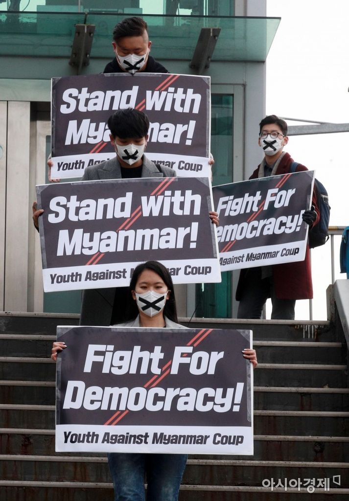 세계시민선언 관계자들이 5일 서울 용산구 미얀마대사관 인근에서 미얀마 쿠데타 규탄 행진 시위를 하고 있다./김현민 기자 kimhyun81@