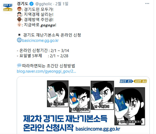 지난 1일 경기도 공식 트위터에 올라온 재난기본소득 신청방법 홍보물. 사진출처 = 경기도 트위터 캡처