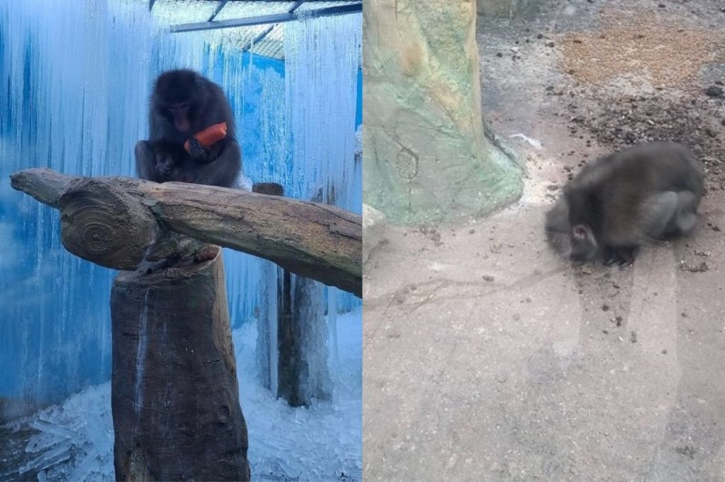 고드름투성이의 사육장에서 제보자가 건넨 당근을 손에 쥐고 있는 원숭이와 땅에 흐르는 물을 핥아먹는 또 다른 원숭이의 모습. 사진=제보자 블로그 게시글 캡쳐