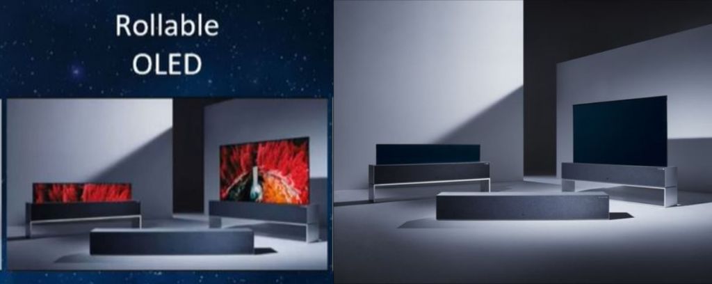 중국 스카이워스가 CES 2021 온라인 설명회에서 자사 롤러블 올레드 TV라고 소개한 사진(왼쪽)과 LG전자의 롤러블 올레드 TV 'LG 시그니처 올레드 R' 사진[스카이워스 CES 2021 캡처, LG전자 제공]