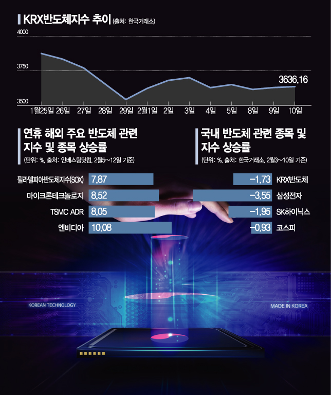 앞서 국내 반도체 업종들은 지난달 사상 최고치를 기록한 이후 설 연휴 전까지 하락세를 이어갔다. 삼성전자는 지난달 11일 장중 9만6800원으로 2018년 주식 분할 이후 사상 최고가를 기록한 뒤 꾸준히 내리막을 걸었다. SK하이닉스도 같은 날 사상 최고가(14만원) 경신 후 줄곧 하향세를 보였다. 연휴 전 1주일간(2월3~10일) 두 종목은 각각 3.55%, 1.95%씩 떨어졌다. 같은 기간 코스피 낙폭 0.93%을 2배 이상 웃돈다. 반도체 대표주들이 주춤하면서 KRX반도체 지수도 부진했다. 지난달 25일 사상 최고치인 3874.53을 기록한 이후 3600대로 주저앉았다. 연휴전 1주일 간 1.73% 떨어진 것이다.