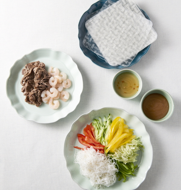 4. 접시에 준비한 모든 재료를 둘러 담고 소스를 곁들인다. (Tip 라이스페이퍼를 찬물에 불려 취향껏 재료를 얹어 소스에 찍어 먹는다.)
